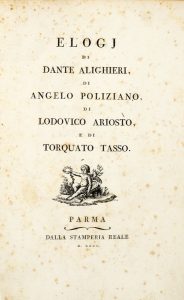 Fabroni Angelo, Elogj di Dante Alighieri, di Angelo Poliziano, di Lodovico Ariosto, e di Torquato Tasso. Parma: dalla Stamperia reale, 1800.