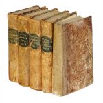 4 volumi in-4° (mm 285x200). Pagine LXXIX, [1] bianca, 837, [1] bianca; 968; 998; 804. Esemplare parzialmente in barbe, con il testo su due colonne. Ampie fioriture e macchie sparse. Legatura coeva in mezza pelle con punte e piatti in carta marmorizzata; fregi e titoli in oro su tassello di pelle verde al dorso. Quasi completamente staccato il dorso del primo volume; abrasioni, mancanze e spellature ai piatti e al dorso degli altri. SI AGGIUNGE: Ariosto Ludovico, Opere [...] con note filologiche e storiche. Trieste: Sezione letterario-artistica del Lloyd austriaco, 1857. In-4° (mm 280x180). Pagine XX, 175, [1], 133, [3], 462, [2] + 1 ritratto dell'Autore in antiporta. Esemplare fiorito, con macchie e aloni di umidità marginali e uno strappo al margine esterno di pagina 97-98 de Le Commedie, che coinvolge il testo. Legatura coeva in mezza tela con punte, piatti in carta marmorizzata e titoli in oro al dorso. Macchie, abrasioni e mancanze ai piatti e al dorso. (5)