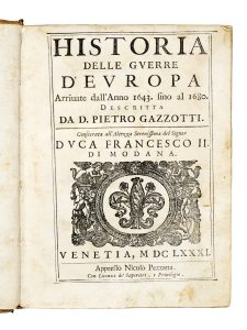 Gazzotti Pietro, Historia delle guerre d'Europa arrivate dall'anno 1643. fino al 1680. Venetia: appresso Nicolò Pezzana, 1681.
