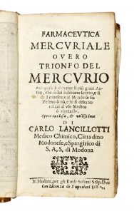 Lancillotti Carlo, Farmaceutica mercuriale. Overo trionfo del mercurio nel quale [...] si da a conoscere al mondo se sia veleno o no, e se si deba accetare al uso medico o rigetarlo... In Modona: per gli eredi Soliani, 1683.