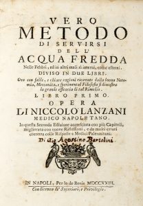 Lanzani Niccolò, Vero metodo di servirsi dell'acqua fredda nelle febbri, ed in altri mali si interni, come esterni. Diviso in due libri. Libro primo (-secondo). In Napoli: per lo de Bonis, 1723.