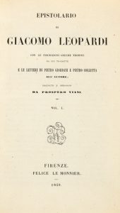 Leopardi Giacomo, Epistolario [...] Raccolto e ordinato da Prospero Viani. Firenze: Felice Le Monnier, 1849.