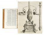 In-folio (mm 320x225). Pagine [2] bianche, [16], 3-4, colonne 5-1280, pagine [28] con 3 tavole calcografiche più volte ripiegate fuori testo. Una vignetta calcografica al frontespizio, una xilografica al colophon e numerose, belle incisioni in rame nel testo, alcune anche a piena pagina. Esemplare ben conservato e riccamente illustrato, con un'incisione applicata alle colonne 1153-1154. Lievi arrossature ad alcune pagine e gore marginali; purtroppo scompleto delle colonne 909-912 e 1169-1172. Legatura in piena pergamena rigida, col nome dell'Autore manoscritto al dorso e i tagli spruzzati in rosso. Macchie, abrasioni alle unghiature e mancanze al piatto anteriore.