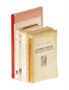 In-8° (mm 225x165). Pagine 33, [3] bianche. Esemplare marginoso, perfettamente conservato. Brossura editoriale, con il frontespizio riprodotto in rosso e nero al piatto anteriore e con i titoli impressi in nero al dorso. Lievemente ingiallito, ma in ottime condizioni. Esemplare n. 402/500, numerato e firmato dall'Autore. SI AGGIUNGONO: Brandi Cesare, Elegie. Firenze: Vallecchi, [1942]. In-12° (mm 195x135). Pagine 91, [1] bianca. Esemplare ben conservato nelle sue barbe. Lievi fioriture marginali ad alcune carte. Entro brossura editoriale con titoli in rosso e nero al frontespizio e al dorso. Fioriture ai piatti e altri minimi difetti, altrimenti buone condizioni. Nota manoscritta all'occhietto. Cassola Carlo, Il taglio del bosco. Venticinque racconti. Pisa: Nistri-Lischi, 1955. In-12° (mm 193x123). Pagine 321, [7]. Ottime condizioni. Legatura in piena tela gialla, con titoli impressi in oro su tassello al dorso; con sovraccoperta editoriale illustrata, con titoli al piatto anteriore e al dorso. Quest'ultima presenta difetti e lievi mancanze. INOLTRE: Piovene Guido, La gazzetta nera. [Milano]: Bompiani, [1943]. Vigolo Giorgio, Linea della vita. Poesie. [Milano]: Arnoldo Mondadori, [1949]. Zavattini Cesare, Parliamo tanto di me [...]. Con sei disegni di Gabriele Mucchi. Milano: Valentino Bompiani, 1937. Selvatico Riccardo, Poesie... Milano: Edizioni del Leone, 1977.