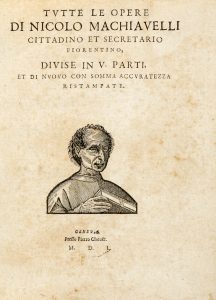 Machiavelli Niccolò, Tutte le opere [...] divise in V parti, et di nuovo con somma accuratezza ristampate. Geneva: presso Pietro Chouet, 1550. [ma 1635-36].