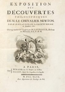 MacLaurin Colin, Exposition des découvertes philosophiques de m. le chevalier Newton... A Paris: chez Durand, rue S. Jacques, au Griffon, 1749.