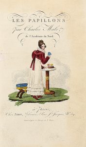 In-24° (mm 135x80). Pagine [2], 198 con 11 carte di tavole fuori testo da disegni di Pancrace Bessa raffiguranti varie specie di farfalle, in coloritura coeva e protette da veline. Graziosa vignetta al frontespizio anch'essa colorata a mano. Esemplare ben conservato con fioriture e macchiette sparse. Legatura coeva in piena pelle con stemma del Collége Royal de Versailles impresso in oro al centro dei piatti e inquadrato da una cornice di filetti e motivi geometrici impressa in oro, titoli dorati su tassello al dorso. Cerniere allentate e segni di usura ai piatti e agli angoli. Custodia in cartonato moderno.