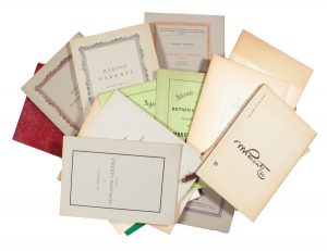 Parenti Marino, Il più celebre dei medici condotti (Leonzio Sartori). Firenze: Sansoni Antiquariato, 1953. 2) Leopardi Monaldo, Lo stampatore e lo scrivano dialogo pubblicato da Marino Parenti. Firenze: Sansoni Antiquariato, 1956. 3) Parenti Marino, Un buon affare del Manzoni. Firenze: Sansoni Antiquariato, 1954. 4) Martini Giuseppe Sergio, Bibliografia essenziale di Marino Parenti scrittore e bibliografo estroso e cordiale. Natale 1952. 5) Seconda copia della stessa opera. 6) Parenti Marino, Bibliografia di edizioni e opere incompiute, sesta dispensa. Firenze: G.C. Sansoni, 1948. SI AGGIUNGONO: 19 tra pubblicazioni, opuscoli, brochure di mostre dalla fine del 1800 al 1960 ca. Raccolta da studiare. (25)