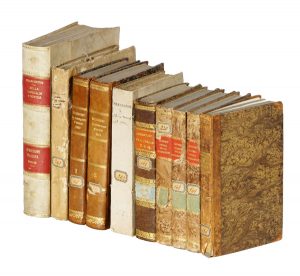3 volumi in-8° (mm 190x120). Pagine [8], 358, [1], [1] bianca; [4], 348; [4], 306, [2] bianche. Marca xilografica al frontespizio di ciascun volume. Fioriture sparse e strappi marginali ad alcune carte del secondo volume, ma complessivamente buone condizioni. Legatura in pieno cartonato marmorizzato, con titoli su doppio tassello di carta al dorso. Tasselli parzialmente staccati o mancanti, e rare macchie ai piatti. SI AGGIUNGONO: Pufendorf Samuel, De officio hominis, et civis secundum legem naturalem libri duo... Francofurti, & Lipsia: impensis Henr. Lud. Broenneri, 1758. In-8° (mm 200x125). Pagine XL, 471, [1] bianca. Marca calcografica al frontespizio. Marginoso esemplare in barbe e parzialmente intonso con fioriture, macchioline sparse e forellini di tarlo marginali ad alcune pagine. Legatura in pieno cartonato, con titoli manoscritti al dorso. Lievi macchie, altrimenti buone condizioni; Caesar Gaius Julius, Comentarj [...] Tradotti da Andrea Palladio. Tomo primo (- secondo). Venezia: Foresti e Bettinelli editore, 1820. In-8° (mm 190x117). Pagine XXXVI, 230, [2] bianche, 1-312. Esemplare marginoso, fortemente fiorito. Legatura coeva in mezza pelle con piatti in carta marmorizzata, fregi e titoli in oro su doppio tassello al dorso. Lievi difetti ai piatti e al dorso. SI AGGIUNGONO: Bazancourt Cesar Lecat (baron de), La Campagne d'Italie de 1859 [...] Premiere partie (-deuxieme partie). Paris: Amyot editeur, 1859, 2 volumi; Dal Pozzo Giulio, Le institutioni della prudenza civile... In Venezia: per Girolamo Albrizzi, 1697; Franchetti Raimondo, Nella Dancàlia etiopica... Verona: A. Mondadori, 1930; Rousseau Jean Jacques, Del contratto sociale, ossia principj del diritto politico... Venezia: dalla Tipografia di Antonio Curti, 1797. (10)