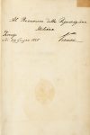 In-4° (mm 275x185). Pagine [8], CLXXXII, [2], 125, 3 bianche con 1 tavola legata in principio. Esemplare in barbe. Bruniture e fioriture diffuse all'interno del testo ma copia ben completa. Legatura ottocentesca in pieno cartonato con titoli al piatto anteriore. Completamente staccato il dorso, altre tracce d'uso ai piatti e lungo le unghiature. Ex-libris cartaceo di Vincenzo Gioberti applicato al contropiatto anteriore; alla carta di guardia precedente il frontespizio dedica autografa dell'Autore: "Al precursore della Rigenerazione / Italiana / Vernon / Firenze / adì 29 Giugno 1848". Al verso della stessa altra indicazione manoscritta di diversa mano "Uno de' dieci esemplari / in Carta distinta".
