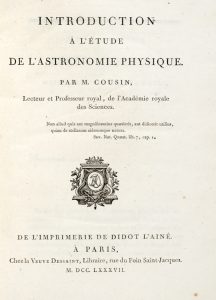 Cousin Jacques Antoine Joseph, Introduction a l'etude de l'Astronomie Physique. A Paris: De l'imprimerie de Didot l'Aine chez la Veuve Dessaint, 1787.