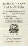 In-4° (mm 255x195). Pagine [7], VIII-XV, [1], 323, 1 bianca, 2 tavole calcografiche fuori testo ripiegate in fine. Piccolo fregio xilografico al frontespizio. Una leggera gora d'acqua nel margine superiore degli ultimi fascicoli, per il resto esemplare perfetto. Legatura coeva in piena pelle bazzana con fregi dorati e titolo in oro su falso tassello al dorso. Tagli rossi, sguardie in carta marmorizzata. SI AGGIUNGE: La Metherie Jean Claude (de), Essai analytique sur l'air pur, et les différentes espècesd'air. Tome premier (-second). A Paris: chez Chuchet, Libraire, rue & hotel Serpente, 1788. 2 volumi in-8° (mm 194x115). Pagine VIII, 447, 1 bianca; VI, 604, [3], 1 bianca. Al primo volume una gora d'acqua nel margine inferiore delle carte, più evidente nei primi e negli ultimi fascicoli, e alcune pagine brunite. Al secondo volume un lavoro di tarlo che interessa il centro dello specchio di stampa (con la perdita di solo poche lettere di testo) e il margine interno delle carte. Legatura coeva in piena pelle bazzana con fregi dorati e titolo in oro su falso tassello al dorso. Tagli rossi, sguardie in carta marmorizzata. SI AGGIUNGE: Saint-Martin Louis Claude (de), Des erreurs et de la verité ou Les hommes rappelles au principe universel de la science. A Edimbourg: s.e., 1782. In-8° (mm 200x120). Pagine [4], viii, 546. Gora nel margine inferiore delle carte. Legatura coeva in piena pelle bazzana con fregi dorati e titolo in oro su falso tassello al dorso. Tagli rossi, sguardie in carta marmorizzata. (4)