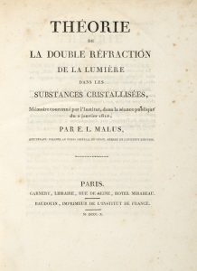 Malus Etienne Louis, Théorie de la double réfraction de la lumière dans les substances cristallisées. Paris: Baudouin, imprimeur de l'Institut de France, 1810.