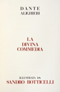 In-folio (mm 485x385). Pagine 512, [8], [2] bianche. Con 93 belle tavole a colori fuori testo protette da velina e stampate su carta pergamena per meglio rendere i disegni originali del Botticelli. Ottimo esemplare marginoso di questa splendida opera. Copia n. 211 di una tiratura di 1999 esemplari. Legatura editoriale in piena pelle, con titoli e fregi in oro al dorso a 6 nervi; sguardie in tessuto bordeaux. Entro solido astuccio in cartone rigido bordeaux ben conservato, ad eccezione di minime macchie.