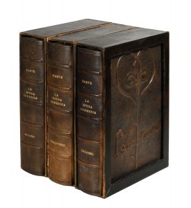 6 tomi in 3 volumi in-folio (mm 340x260). Pagine 158, [4]; [10], 173-326, [6] con 34 tavole a colori numerate fuori testo. 162, [6]; [8], 173-328, [4] con 33 tavole a colori numerate fuori testo. 163, [3]; [10], 173-320, [2] con 33 tavole a colori fuori testo numerate. Con nel complesso 100 tavole a colori di Dalì, a fogli sciolti. Ciascuna parte con proprio frontespizio; frontespizi e titoli stampati a due colori: rosso per i due tomi dell'Inferno, viola per il Purgatorio e blu per il Paradiso. Ottimo esemplare ad ampi margini, in barbe. Lievissime e sporadiche bruniture e fioriture ad alcune tavole. Copia n. 2765 su una tiratura complessiva di 3044 copie, uno dei 2900 numerati da 1 a 2900. Splendida legatura editoriale in pelle con piatti anteriori in bronzo decorato a sbalzo con tre diverse illustrazioni allegoriche, titoli impressi in oro ai dorsi a 5 nervi. Entro cofanetti in pelle lisi e con gravi difetti; staccato uno dei piatti del cofanetto contenente il Purgatorio e il dorso di quello contente il Paradiso. (3)