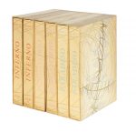 6 volumi in-folio (mm 334x260). Pagine [2], 158, [2], [2] bianche con 17 tavole sciolte a colori fuori testo numerate 1-17; [10], 173-326, [4] con 17 tavole sciolte a colori fuori testo numerate 18-34; [2] bianche, 163, [1], [2] bianche con 17 tavole sciolte a colori fuori testo numerate 1-17; [2] bianche, [8], 173-320, [6], 2 bianche con 16 tavole sciolte a colori fuori testo numerate 18-33; [2] bianche, 162, [2], [2] bianche con 17 tavole sciolte a colori fuori testo numerate 1-17; [2] bianche, [7], 173-328, [8] con 16 tavole sciolte a colori fuori testo numerate 18-33. Opera in barbe a fascicoli sciolti, stampata in nero; testo a due colori, rosso per i due tomi dell'Inferno, viola per il Purgatorio e blu per il Paradiso. Ottime condizioni. Ciascun volume entro brossura con titolo in rosso al piatto anteriore, cartella e custodia in cartonato editoriali a motivi geometrici colorati, con lievi macchie e difetti. Conservati anche i tagliandi di controllo. Copia n. 2217 su una tiratura complessiva di 3044 esemplari, uno dei 2900 numerati da 1 a 2900 impressi dalla Stamperia Valdonega, su carta a mano dei Fratelli Magnani di Pescia. (6)
