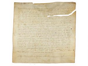 1371. TESTAMENTO DE BRUNISSENDA, MUJER DE PERE FERRER D'ULTRAMORT. Manuscrito sobre pergamino, 33x35 cm. Notario Guillem Pons, dado y firmado el 27 de julio de 1371. Rotura con pérdida.