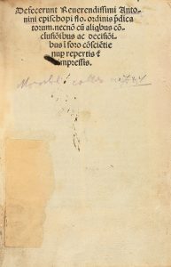 .1499.. LIBRO: .(INCUNABLE).. .FLORENTINUS, ANTONINI:. .DEFECERUNT REVERENDISSIMI...ORDINIS P[RAE]DICATORUM NECNO[N] CU[M] ALIQ[UE]BUS CO[N]CLUSIO[N]IBUS AC DECISIO[N]IBUS I[N] FORO CO[N]SCIE[N]TIE NUC REPERTIS & IMPRESSIS.. Venice: Petrus de...