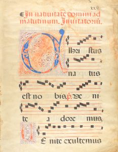 notación cuadrada en negro. Grandes capitales en rojo y azul. Primera y única rúbrica conservada ´in nativitate domini ad matutinum, empieza: ´Christus natus est nobis´. La foliación indica que se trata de las hojas inicial y final de un pliego que contenía un antifonario, que en la parte conservada corresponde al oficio litúrgico de la fiesta de Navidad (maitines).
