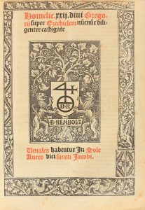 .1512.. LIBRO: .(GÓTICO).. .SAN GREGORIO:. .HOMELIE XXII DIVIGREGORII SUPER EZECHIELEM.... Paría: Imp. Berthold Rembolt, 1512. 8º. 7 h., incluye retrato xilográfico + CVII fol. Portada con marca tipográfica y orla floral xilográficas, a dos...