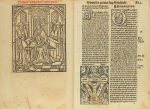 tintas. Bellas capitales ilustradas. Texto a dos columnas con apostillas marginales, en tipografía gótica. Algo corto de margen superior, ligero cerco de humedad. Enc. en tafilete rojo por Tejerina. Buen ejemplar.
