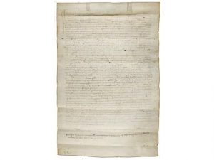 13??. (RUPIA). DONACION Y TESTAMENTO DE UNA ESTANCIA EN EL MAS SAMASSO, CASA FORTIFICADA (MAS SAMANÇO), HOY GÜELL DE RUPIA. Hecha por Pere Mund a favor de Guille. Donación de 30 sueldos en moneda barcelonesa. Manuscrito sobre pergamino, 54x35 cm.