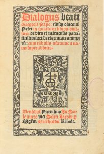.1513.. LIBRO: .(GÓTICO).. .SAN GREGORIO:. .DIALOGUS BEATI GREGORII PAPE: Eiusque diaconi Petri in quattuor libros divisus: da vita et miraculis patrum italicorum, et de eternitate animatum.... Paris: Imp. Berthold Rembolt, 1513. 8º mayor. LIX fol....