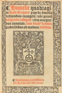 .1518.. LIBRO: .(GÓTICO).. .SAN GREGORIO:. .HOMELIE QUADRAGITA BEATI GREGORII de diversis lectionibus evangelii.... Paris: Imp. Berthold Rembolt, 1518. 8º. 105 fol. + 5 h. Portada con marca tipográfica y orla floral xilografiadas, a dos tintas....