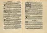DILIGENTISSIME CONGESTUM EST.. Paris: Magister Petrus Vodove, Impensis Galiot du Pre, bibliopolae, decimo quinto kanedas Maii, 1518. 8º mayor. 6 h., inclusive portada a dos tintas impresa en tipos góticos, y marca del impresor grabada en madera, que se repite al final de la obra + 332 folios numerados a la romana. Profusión de letras capitales e inciales grabadas en madera de diversos tamaños y diseños. La última hoja de preliminares contiene la ´aprobación´ en lengua francesa con tipos góticos y la letra capital y título: ´Extraict des registres de parlement´ en tinta roja. Enc. original de la época en pergamino flexible con restos de cintas para atar, y título rotulado en el plano. Notas manuscritas de propiedad en la hoja de guardas fechada en 1531. Segunda edición de esta obra considerada una ´enciclopedia del saber´ que incluye hechos y descubrimientos cercanos como la imprenta ´De Gutemberg argentinensi´; el descubrimiento de America, ´De Christophoro Columbo´, etc. Alden 518/4.