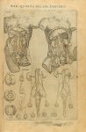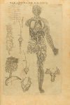 y hojas sin numerar como sigue: 42 láminas grabadas: después del folio 28, 10 hojas; d. del folio 59, 19 hojas; d. del folio 70, 9 hojas; d. del folio 77, 2 hojas; d. del folio 82, 6 hojas; d. del folio 97, 8 hojas; d. del folio 106, 7 hojas, inclusive la hoja de ´erratas´. Sombra de antigua humedad en algunas hojas, puntos de óxido y alguna página oscurecida. Bonito grabado calcográfico en la portada con el escudo central del cardenal y arzobispo de Santiago, con antigua anotación manuscrita y sello de antigua biblioteca monástica barcelonesa. Una hoja añadida en el siglo XVII (1636) enfrente de la lámina correspodiente a los riñones, contiene dos notas manuscritas que ocupan ambas páginas, referentes a operaciones de riñón efectuadas en la enfermería del convento de los Capuchinos de Santa Madrona (Barcelona). 42 láminas grabadas calcográficamente y dibujadas por GASPAR BECERRA que representan el cuerpo humano (de hombre y mujer) y letras capitales xilográficas. Enc. moderna en plena piel con ruedas doradas en los planos y lomera cuajada. Exlibris de anterior poseedor. PRIMERA EDICIÓN de la más importante obra de ´anatomía humana´ después de la de Vesalio, y complementaria de ella. Juan Valverde, médico anatomista nacido en Amusco, Palencia, hacia 1525, marcha a Italia en 1542 donde ejerce de médico y profesor en Roma. Es el gran seguidor español de la nueva anatomía establecida por Andrea Vesalio en 1543 con su obra De humani corporis fabrica. Muchos de estos grabados son réplicas de las ilustraciones de Vesalio, y otras, con importantes avances científicos, son originales atribuidos a Gaspar Becerra, claramente influido por Miguel Ángel. Los grandes logros de Valverde son las correcciones a los clásicos e incluso a Vesalio, así como novedades sobre los músculos y órganos, en especial el ojo. Pero la importancia de la obra no solo radica en su aportación a la medicina sino también al uso del castellano como lengua de divulgación científica). Valverde es considerado como el anatomista español más importante del Renacimiento. Palau 349366.