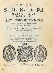 .1568.. FOLLETO: .(BULA).. .PII PAPAE QUINTI:. .BULLA S. D. N. D. PII DIVINA PROVID. PAPAE QUINTI EXTENSIONIS OMNIUM PRIVILEGIORUM ORDINIBUS MENDICANTIUM PER S. SANCTITATEM CONCESSORUM CUM EORUM NOVA CONCESSIONE PRO CONGREGATIONE REGULARIS.... Romae:...