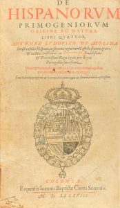.1588.. LIBRO: .(HISTORIA).. .MOLINA, LUCOVICO DE:. .DE HISPANORUM PRIMOGENIORUM ORIGINE AC NATURA.. Colonia: Joannis Baptistae Ciotti Senensis, 1588. Folio menor. 6 h. inclusive portada a dos tintas con gran escudo real de España + 536 p.+ 26...