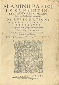 .1595.. LIBRO: .(DERECHO).. .PARISII, FLAMINII:. .DE RESIGNATIONE BENEFICIORUM TRACTATUS. COMPECTEENS TOTAM FERE PRAXIM BENEFICIARIAM.. Venetiis: Apud Haeredem Hieronymi Scoti, 1595. 2 tomos en un vol. en folio menor. Texto a dos columnas, capitales...