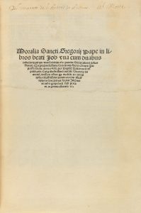[Brescia]:Angelus Britannicus, 2 de junio 1498. 8º mayor. Tipografía gótica muy pequeña. 51 líneas. Texto a dos columnas. Letras capitales xilográficas. 426 h. (sin numerar), inclusive la última blanca. Preciosa encuadernación firmada BRUGALLA, en plena piel marrón oscuro con los planos estampados de diversos hierros fríos formando plancha, doble filete dorados en los cantos y cejas, nervios y hierros fríos en el lomo y letrería dorada gótica para el título, los tres cortes dorados. Precioso incunable y grueso volumen magníficamente impreso sobre papel de alta calidad, con alguna pequeña galería restaurada. Esta edición contiene todo el texto íntegro de las Morales de San Gregorio. Es una edición apreciada. Copinger 2780. Goff G-434.
