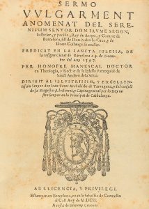 .1602.. LIBRO: .(HISTORIA-CATALUNYA).. .MANESCAL, HONOFRE:. .SERMO VULGARMENT ANOMENAT DEL SERENISSIM SENYOR DON IAUME SEGON, Iusticier, y pacific, Rey de Arago, y Compte de Barcelona, fill de Don Pedro lo Gran, y de Dona Constança sa muller.......