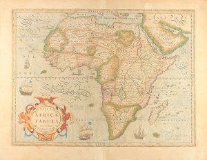 .1610 ca.. MAPA: .(ÁFRICA).. .HONDIUS, F.:. .NOVA AFRICAE TABULA.. Ammstelodami, 1610 ca. Mapa calcográfico. Papel: 45,5 x 57,5 cm; huella: 37,5 x 51,5 cm. Iluminado a mano. Reverso con texto en latín con capital y culs-de-lampe xilografiadas. Es...