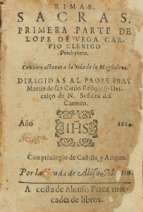 .1614.. LIBRO: .(LITERATURA-SIGLO DE ORO).. .VEGA CARPIO, LOPE DE:. .RIMAS SACRAS.. [Madrid]: Con privilegio de Castilla, y Aragón, por la viuda de Alonso Martín, a costa de Alonso Pérez mercader de libros, 1614. 8º menor. 12 h. + 188 fol. + 6 h....