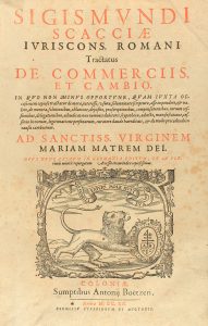 Portada a dos tintas y con grabado marca del impresor. Texto a dos columnas. Algún pliego algo tostado. Enc. en pergamino flexible de época, lomera rotulada con caligrafía gótica. Magnífico ejemplar. Primera edición publicada en Alemania de esta importante obra sobre derecho financiero. La primera edición apareció un año antes en Roma. Scacciae fue un destacado jurista de su época dedicado también a activiades de comercio, el conocimiento de ambos mundos le impulsó a escribir este tratado, de gran interés para el derecho financiero.