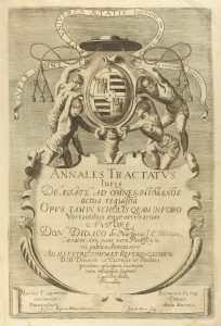 Coello Diego Díaz, 1642. Folio menor. 14 h.(inclusive retrato)+ 697 p.+ 49 h. de índices. Enc. original en pergamino flexible con lomera rotulada en caligrafía gótica. Portada calcográfica dibujada por Fr. Joanes Baptista Mainus [´Fr. Joanes Baptista Mainus, delineavit / Juan ed Noort. Sculp´.] y grabada por Joan de Noort. Retrato del autor dibujado por el mismo Mainus, y grabado por Doña Maria Eugenia de Beer [´Fr. Joannes Baptista Mainus. delineavit / Dª . Mª. Eugeª de Beer. sculp.´] Rara así, con todos los grabados. Esta obra trata sobre los actos legales que los hombres pueden realizar o le son atribuidos según su edad, por orden cronológico de nacimiento. Palau 187621.