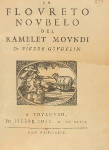 .1647.. LIBRO: .(LENGUA OCCITANA).. .GOUDELIN, PIERRE:. .LA FLOURETO NOUVBELO.. Toulouso: Per Pierre Bosc, 1647. 8º mayor. 104 p. + 31 p. Bonita xilografía en portada. Bellamente ilustr. con cabeceras, capitales y culs-de-lampe xilografiadas....