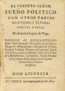 .1652.. LIBRO: .(MADRID).. .LOPEZ DE VEGA, ANTONIO:. .EL PERFETO SEÑOR. SUEÑO POLÍTICO CON OTROS VARIOS DISCURSOS, I ULTIMAS POESIAS VARIAS.. Madrid: Imp. Real, 1652 (impreso por error 1852). 8º mayor. 6 h. + 259 p. Enc. en pergamino de época...