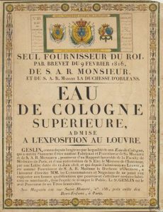 Parfumeur, 1816 - Eau de Cologne de François Marie Farina. Brevet de seul fournisseur du Roi, de S.A.R. Mon-sieur et de S.Ar. Madame la Duchesse d’Orléans, donné à Mr Geslin, tenant magasin rue Saint-Honoré, n° 188. Affiche imprimée avec frise