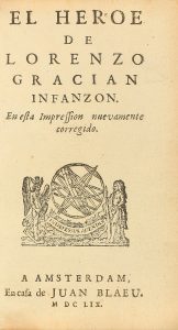 cartógrafo holandés Joan Blaeu. Temprana edición publicada por primera vez en Huesca 1637, esta es la primera vez que se imprime fuera de España. La suma de ejemplares conservados de las cuatro primeras ediciones no llegan a diez, lo cual nos da una idea de la rareza de la obra. Primera obra de su autor que ya marca la dirección de sus escritos, todos con aire moralista, En ´El Heroe´ expone 20 ´primores´ que deben caracterizar el hombre excepcional, el rey gobernante o caudillo militar. Esta edición que presentamos tiene en sí (por el impresor) un marcado acento europeista. Salvá 2075. Palau 106858. Simón Díaz XI, 1681.
