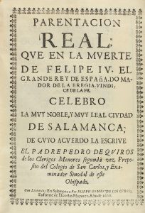 .1666.. LIBRO: .(PANEGÍRICO).. .QUIROS, PEDRO DE:. .PARENTACION REAL QUE EN LA MUERTE DE FELIPE IV· EL GRANDE REY DE ESPAÑA DOMADOR DE LA EREGIA VINDICE DE LA FE. CELEBRO LA MUY NOBLE, Y MUY LEAL CIUDAD DE SALAMANCA, DE CUYO ACUERDO LA ESCRIVE EL...