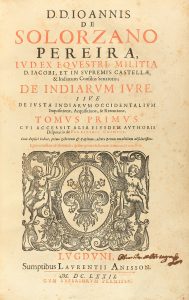 .1672.. LIBRO: .(DERECHO).. .SOLORZANO PEREIRA, IOANNIS DE:. .DE INDIARUM IURE. SIVE DE IUSTA INDIARUM OCCIDENTALIUM INQUISITIONE, ACQUISITIONE, & RETENTIONE.. Lugduni [Lyon]: Laurentii Anisson, 1672. 2 vol. en folio menor. I: 12 h.+ 438 p.+ 43 h....