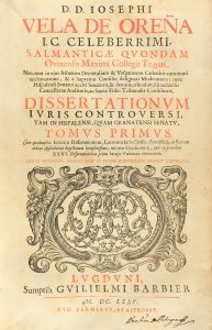 .1675.. LIBRO: .(DERECHO).. .VELA DE OREÑA, IOSEPHI:. .DISSERTATIONUM IURIS CONTROVERSI TAM IN HISPALENSI, QUAM GRANATENSI SENATU.. Lugduni [Lyon]: Sumpt. Guilielmi Barbier, 1675. 2 vol. en folio. I: 6 h.+ 507 p.+ 47 h. de índices. II: 4 h.+ 362...