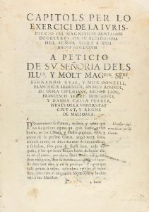.1678.. FOLLETO: .(DERECHO-MALLORCA).. .MOSTASAPH, [DE MALLORCA]:. .CAPITOLS PER LO EXERCICI DE LA JURISDICCIO DEL MAGNIFICH MOSTASAPH DECRETATS PER SU ILLUSTRISSIMA DEL SEÑOR VIRREY A XXXI. AGOST MDCLXXVIII.. Palma: s. imp., 1678. 4º mayor. 14 h....