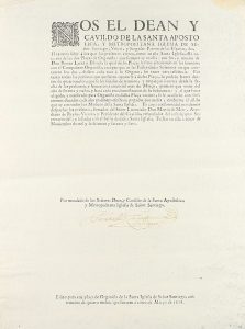 de papel verjurado conservando todos sus márgenes. Tipografía a línea tirada, letra capital xilográfica. Firma autógrafa del secretario del cabildo de la catedral. Conserva todos los márgenes naturales. Empieza: Nos el Dean y Cavildo de la...metropolitana iglesia de Señor Santiago, Unico y Singular Patron de las Españas...Hazemos saber a los que las presentes vieren, como en esta Santa Iglesia, está vaca una de las dos Plaças de Organista (que siempre ay en ella) por fin, y muerte de Don Benito Larraz y Estrada, la qual dicha Plaça, se sirve alternando en las semanas, con el Compañero Organista, escepto que en las Festividades Solemnes en que concurren los dos, assisten cada uno a su Organo, sin tener otra residencia..., fechas en ella a cinco de Noviembre de mil y seiscientos y setenta y siete. Impreso rarísimo de corto tirage. El dean y cabildo de la iglesia de Santiago convoca una plaza por oposición, de organista (de las dos que existen) por muerte de Benito Laraz y Estrada, uno de ellos.