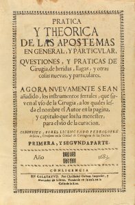 Impresor y Mercader de Libros, 1683. 4º mayor. 2 h.+ + 2 lám.+ 388 p.+ 3 h. (tablas). Enc. en pergamino antiguo recuperado. Conserva todos los márgenes y el papel aunque es de baja calidad, se encuentra en buen estado de conservación. Las dos láminas reproducen grabados en madera los utensilios necesarios para las operaciones de cirugía. Segunda edición, la primera es de Sevilla 1628. Tenemos pocos datos biográficos del autor aunque conocemos que estudió medicina en Sevilla bajo la tutela de Bartolomé Hidalgo de Agüero. Fue nombrado, después, cirujano real de Galeras y, como tal, embarcó hacia América. Al llegar al continente americano se estableció en Cartagena de Indias, haciéndose cargo del hospital de esa ciudad, donde actuó como cirujano durante más de veinticuatro años. Desconocemos si regresó a España y esta obra es la única que nos ha legado, dividida en dos partes; En la primera se trata de los apostemas en general, el flemón y los apostemas en particular; en la segunda parte se plantean cuestiones prácticas de cirugía y se estudian las heridas, úlceras, fracturas y dislocaciones de las distintas regiones del cuerpo; asimismo, se estudia el morbo gálico y se incluyen un amplio antidotario y treinta y nueve recomendaciones y reglas para ejercer la cirugía. Al final incluye aforismos de Hipócrates. Palau 141307.