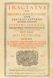 .1690.. LIBRO: .(DERECHO).. .MALDONADO ET PARDO, IOSEPHO:. .TRACTATUS DE SECUNDA SUPPLICATIONE, SIVE RECURSUS ADVERSUS REVISIONIS SENTENTIAS SUPREMI SENATUS, REGIAMQUE CHANCELLARIARUM, ET ALIORUM TRIBUNALIUM HUIUS REGNI.. Madrid: Bernardo de...